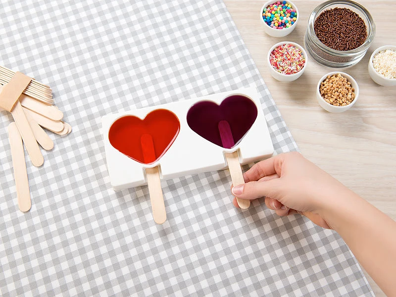 Stiel-Eis geht immer – und zwar zu jeder Jahreszeit! Füllen Sie die 2 Silikon-Förmchen mit Flüssigkeit, setzen Sie die Stiele ein und ab damit in den Tiefkühler. Schon nach wenigen Stunden genießen Sie Ihr selbst zubereitetes Lieblingseis in Herzform!