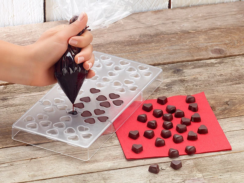 Ganz einfach: Schokolade Ihrer Wahl schmelzen und in die Vertiefungen geben. Jetzt nur noch kalt stellen, damit die Schokolade fest wird: Die stabilen Formen aus Polycarbonat sind für Kühl- und Gefrierschrank geeignet. Anschließend lassen sich die Herzen leicht aus der Form lösen.