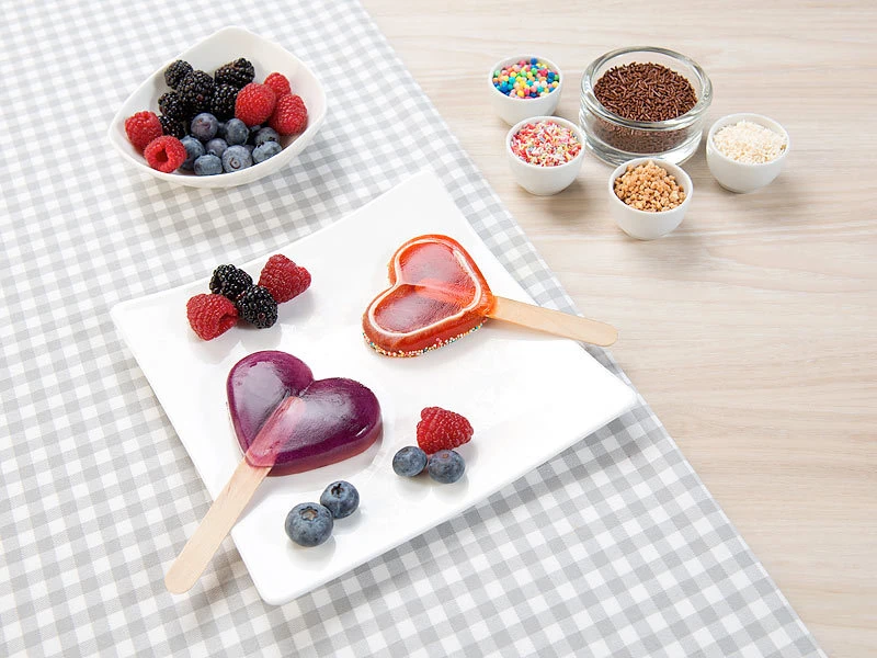 Stiel-Eis geht immer – und zwar zu jeder Jahreszeit! Füllen Sie die Silikon-Förmchen mit Flüssigkeit, setzen Sie die Stiele ein und ab damit in den Tiefkühler. Schon nach wenigen Stunden genießen Sie Ihr selbst zubereitetes Lieblingseis in Herzform!