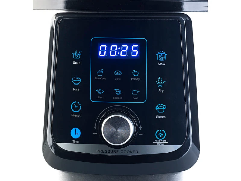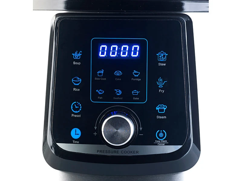 - LED-Touch-Display mit 11 Voreinstellungen (Zeit und Temperatur) für Suppe, Reis, Fisch, Meeresfrüchte, Eintopf, Kuchen und Brei/Porridge, zum Schongaren (Slow Cooking), Braten, Dämpfen und Backen
